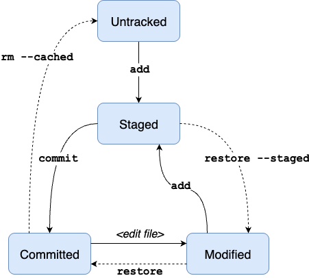 Verwijdert bestand(en) terug uit Git.git rm --cached : Bestand bewaren in working directory (untracked). |