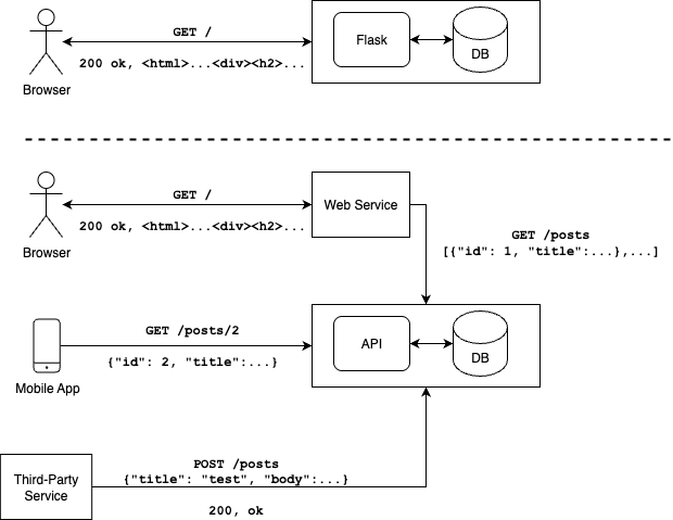 De server wordt dan een API of Application Programming Interface, een verzameling afspraken (regels en functies) waarmee softwareonderdelen met elkaar kunnen praten. Die onderdelen kunnen lokaal binnen eenzelfde systeem of programma zijn – bvb. de verzameling standard functies en classes in Python. Maar die onderdelen kunnen ook aan een typisch client-server model voldoen, zoals een web-API waarmee blog posts kunnen worden opgehaald, aangemaakt of gewijzigd.